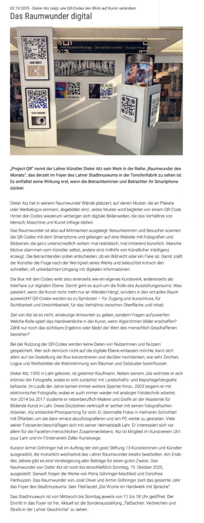 Im Rahmen der Ausstellung RAUMWUNDER ,präsentierte ich eine ortsspezifische Installation, die sich der digitalen Vermittlung und Wahrnehmung von Kunst widmet. Sichtbar waren lediglich QR-Codes – reduziert auf das Wesentliche und doch voller Potenzial. Jeder Code ist ein Portal, ein Zugang zu einem einzelnen Kunstwerk, das sich ausschließlich digital offenbart.